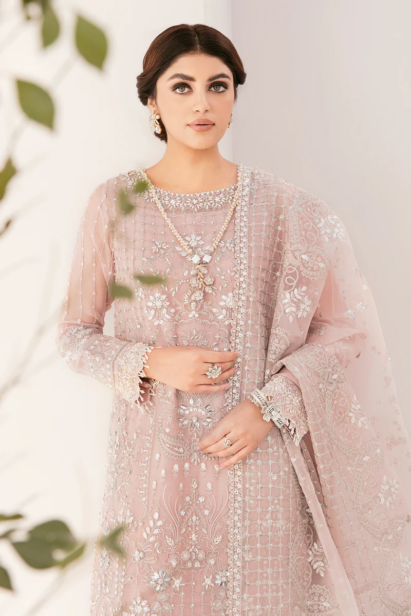Delve into the epitome of luxury with a pink salt coloured 3 Piece chiffon ensemble, featuring a shirt embellished with hand crafted embroidery. The delicately carved embroidery covers the neckline, front and sleeves. The shirt is accompanied by an embroidered organza dupatta adorned with iridescent sequin work. An embroidered silk trouser completes the outfit. Stitched or unstitched? The choice is all yours.